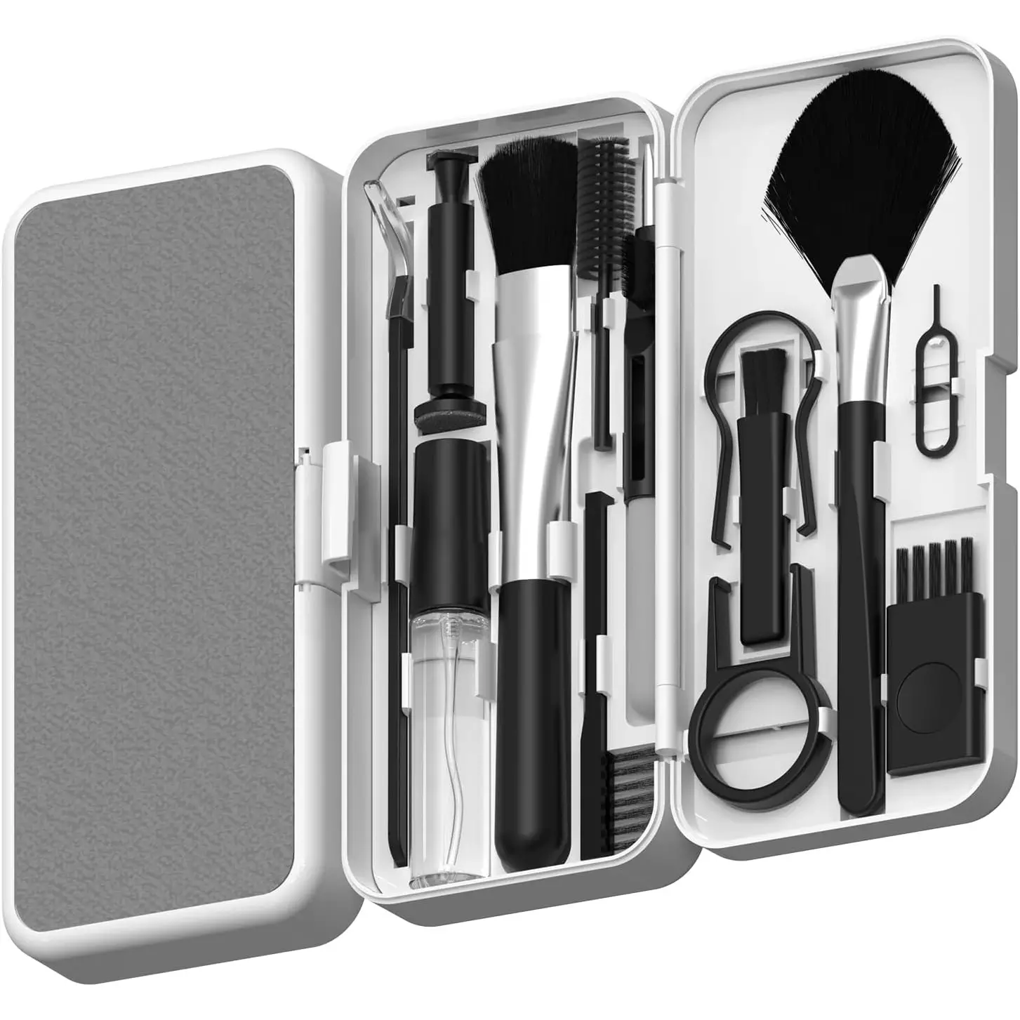 - 【Multi-purpose Cleaning Kit】Electronic cleaning kit includes cleaning pen with metal tip, sponge brush, mini soft brush, round brush, keyboard brush, keycap puller, switch puller, spray bottle, fiber fleece swipe, air blower with long and short nozzles, lens cleaning pen with soft pad, hard bristled brush and soft-bristled brush, and a card remover. The cleaner kit can efficiently clean laptops, keyboards, headphones, screens, phones, etc.
