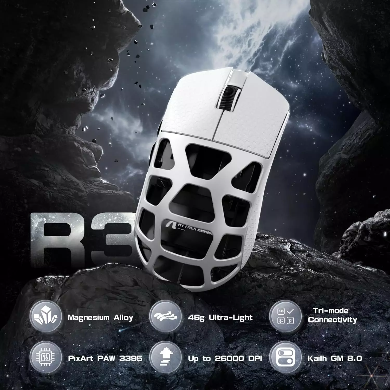 ATTACK SHARK R3 46g Superlight Magnesium Alloy Wireless,Bluetooth & Wired Gaming Mouse, 8KHz Polling Rate, PAW3395 26K DPI Sensor Programmable With Griptape (Silver)