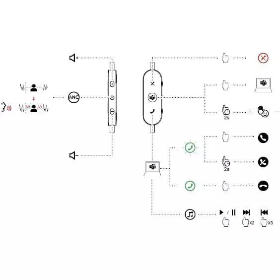 - Intuitive In-Line Controls: Take control of your Teams, calls, and audio experience effortlessly with our intuitive in-line controls. Adjust microphone mute/unmute, volume, play/pause, ANC, and even activate talk-through mode, all at your fingertips, making your headset a truly user-friendly companion.