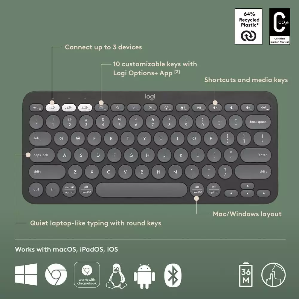 - A Design Choice You’ll Feel Good About: Plastic parts in the Pebble Keys 2 K380s Slim Keyboard include minimum 49% certified post-consumer recycled plastic (1)