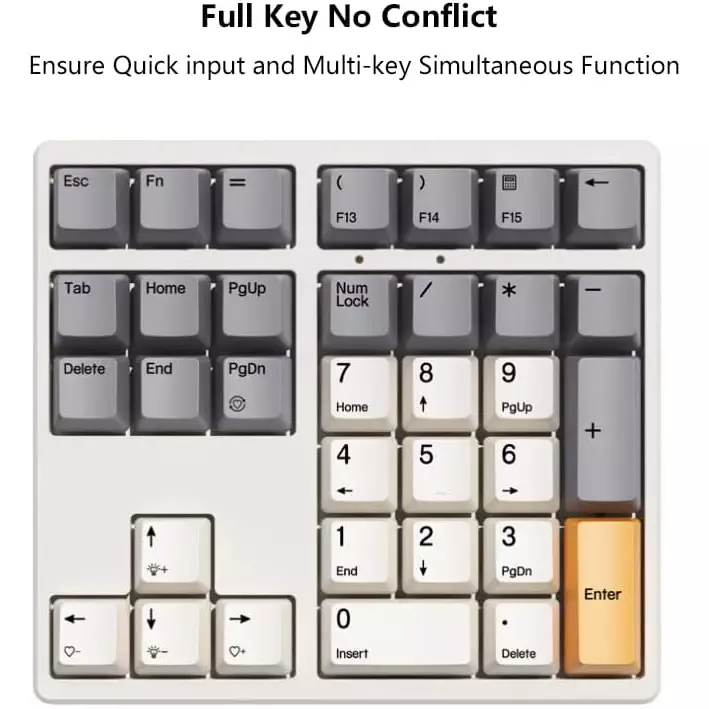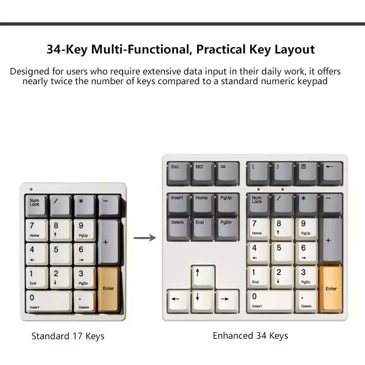 - 【PBT Dye-Sub Keycaps&White Backlit Effects】Continuing the 17-key numeric keyborad that was already available before, the 34-key [5.87in*5.28in*1.54in ]numeric keypad also features PBT keycaps for enhanced texture and durability. Made of thermal sublimation technology, the characters will not fade over time. White backlight to create a different atmosphere for use, you can also choose other static backlight modes.Please note: the lights are not visible through the keycaps