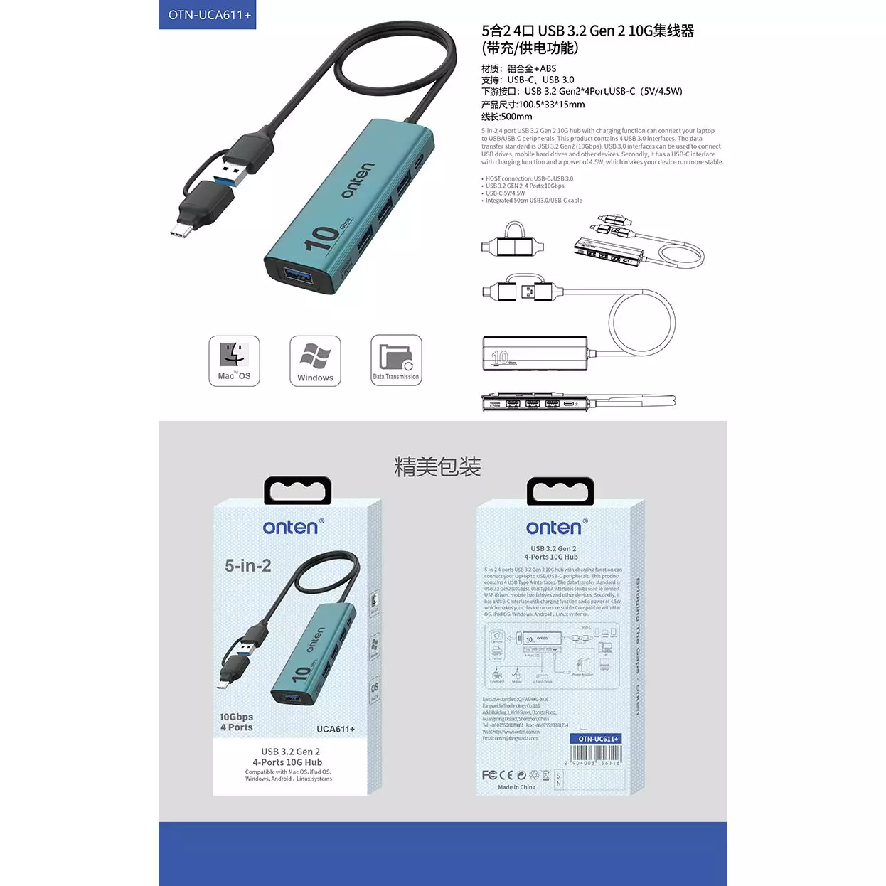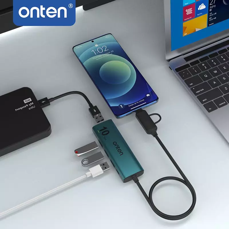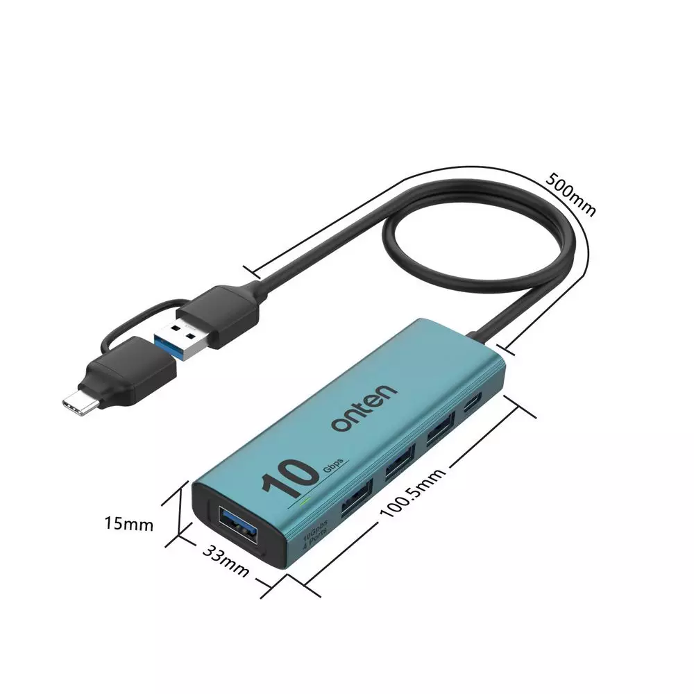 ONTEN UCA611+ 5 in 2 TypeC + USB to 4-Port USB3.2 Gen 2 10Gbps Aluminum Design