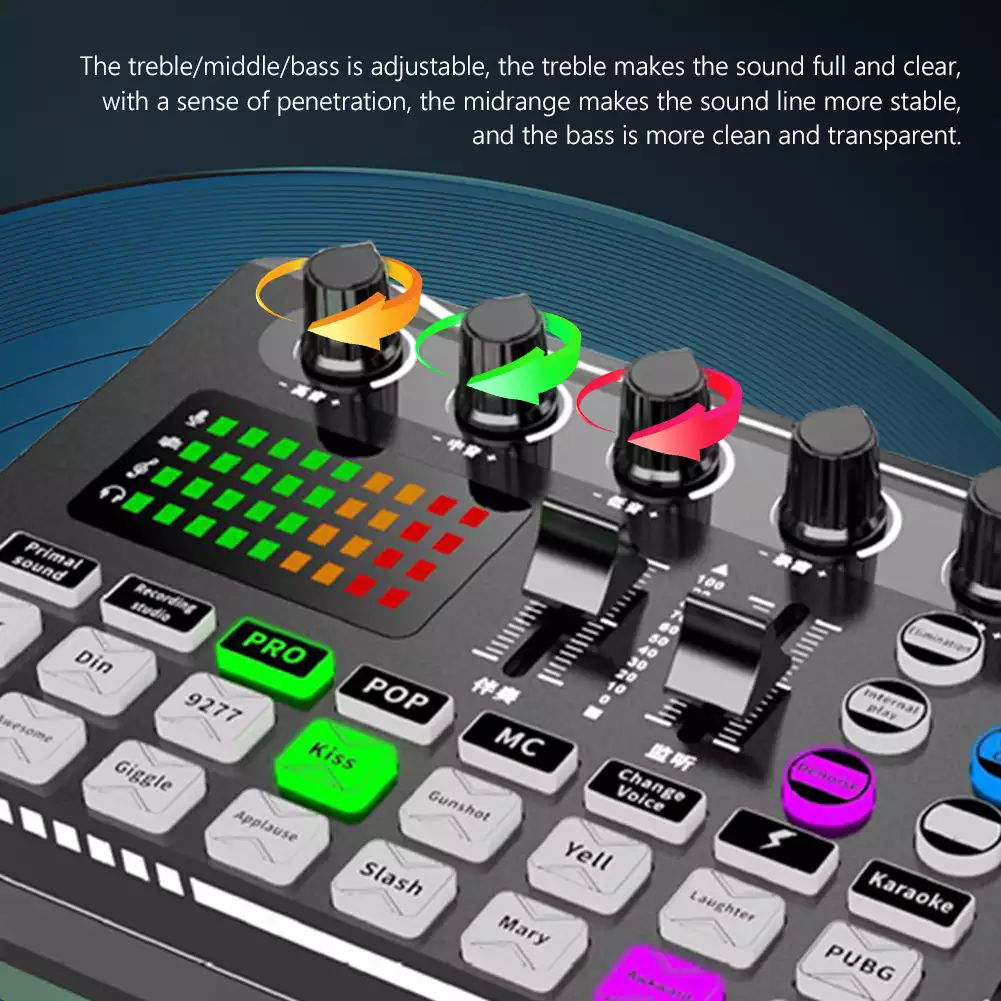 Multi-function tuning sound card, with complete functions, simple operation, convenient use and built-in lithium battery. Common to mobile phones and computers.