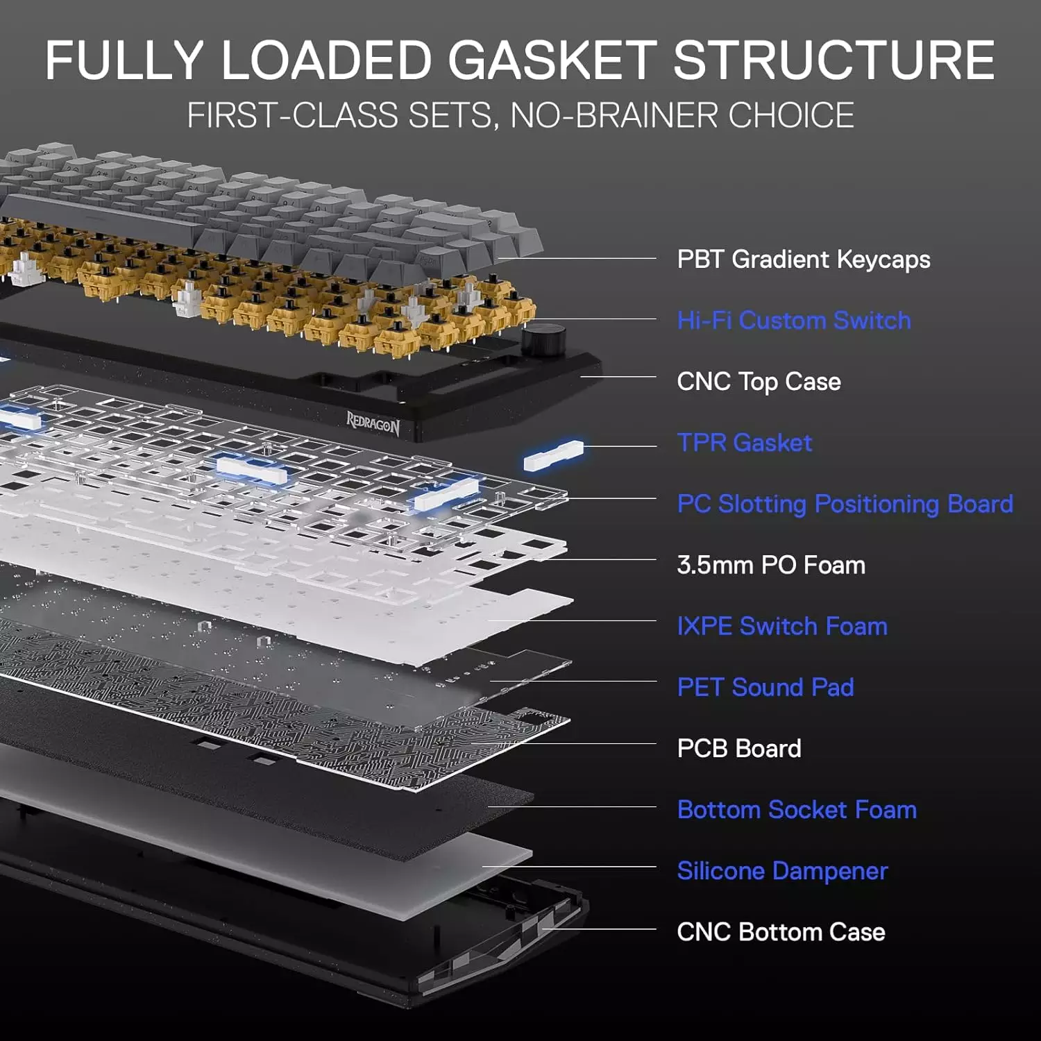 - Hi-Fi Custom Switch – With thick-lubed custom linear switches combo with a gasket form factor, which features faster, creamy and elastic typing feedback. The brand new upgraded socket is nearly all switches(3/5 pins) compatible.