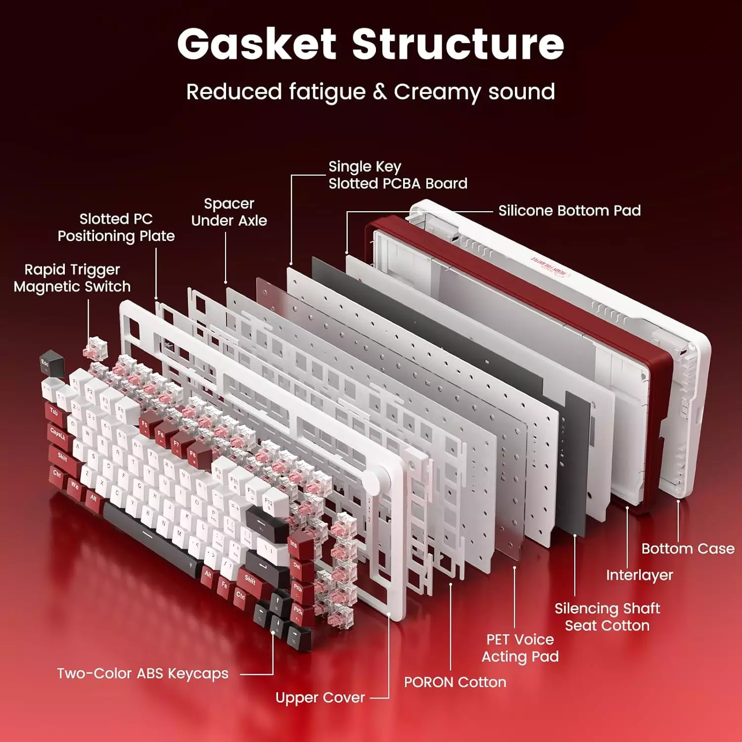 - 【Gasket Structure & PCBA Single Key Slotting】K721 magnetic keyboard adopts a gasket structure, combining flexibility and stability while using pcb single-key slotting to better optimize the rebound and stability, feel more comfortable and soft elastic, and increase poron and silicone padding-bottom cotton between pcb and positioning board to reduce the noise of knocking and sound more pure