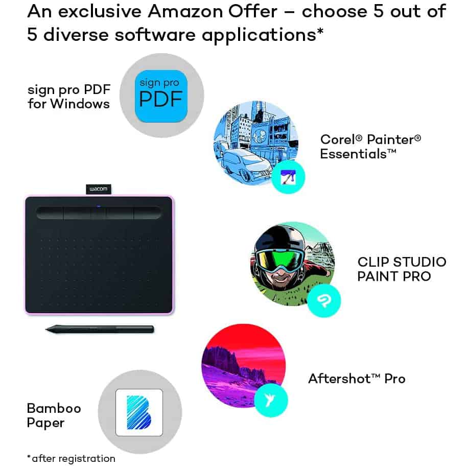 - Items Delivered: 1 x Wacom Intuos Pen Tablet (medium) berry with 4K battery-free pen and USB cable, Corel Painter Essentials 7, Corel Aftershot Pro 3 (both 90 days license), Clip Studio Paint Pro (2-year license), Bamboo Paper (Free Pro Pack on Windows 10), Sign Pro PDF for Windows