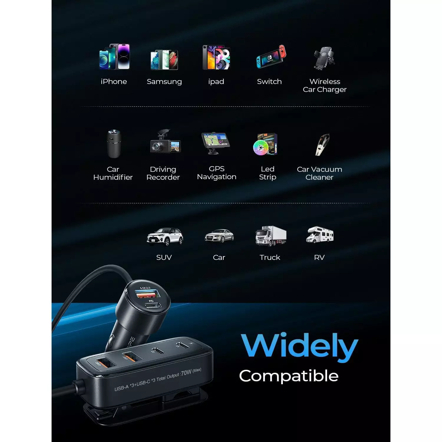 - 👍【Wide Compatibility】This car charger is compatible with all electronic devices, such as iPhone, Samsung Galaxy, Google Pixel, all smartphones, iPad, AirPods, wireless chargers, nintendo switch, cameras and other devices. Universal for 12-24V vehicles, suitable for mainstream models such as cars, SUVs, trucks, and RVs.