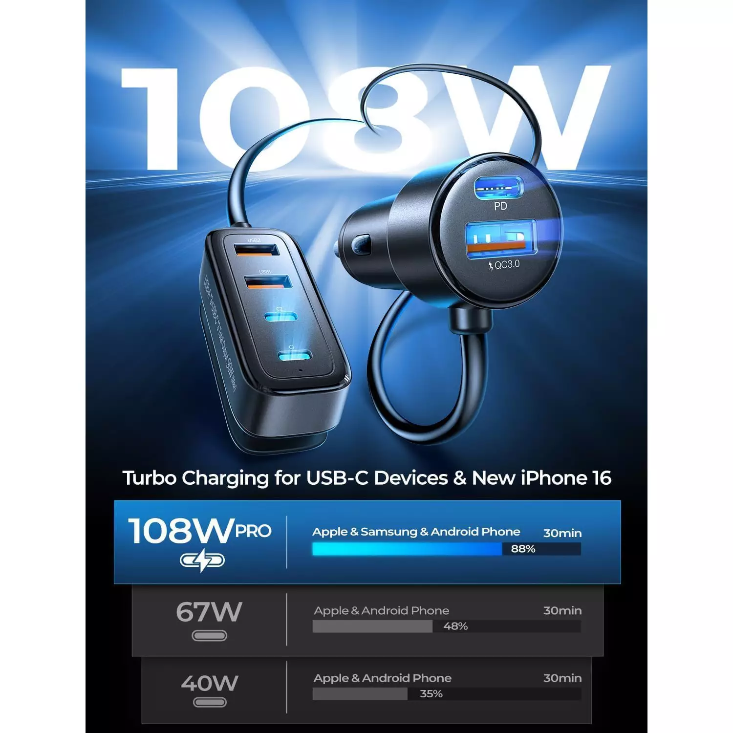 - 👍【30 Minutes Super Fast & 3 Type-C Ports】2024 latest upgraded cigarette lighter USB charger has 3 PD3.0 Type C ports, charging 3 devices at the same time will not cause slow charging. The driver’s side 30W USB car charger charges your iPhone 15 from 0% to 88% in just 25 minutes. Rear Seat PPS 20W Car Charger USB c can charge Samsung S24 from 0%~80% in just 35 minutes. 5x faster than standard USB C car adapter. Suitable for all USB devices to provide super charging needs.