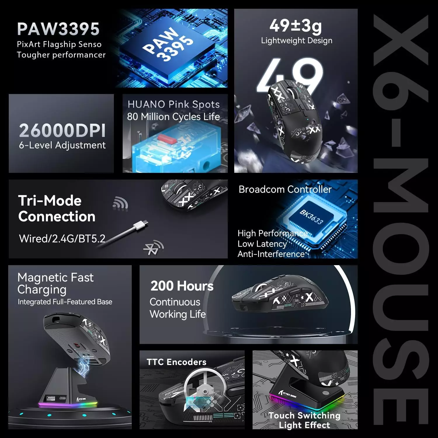 - The X6 Gaming Mouse is equipped with the latest PixArt 3395 flagship sensor, with a DPI of up to 26,000 and can be adjusted in 6 levels. Whether you use it for daily work or professional gaming, X3 can easily meet your needs.
