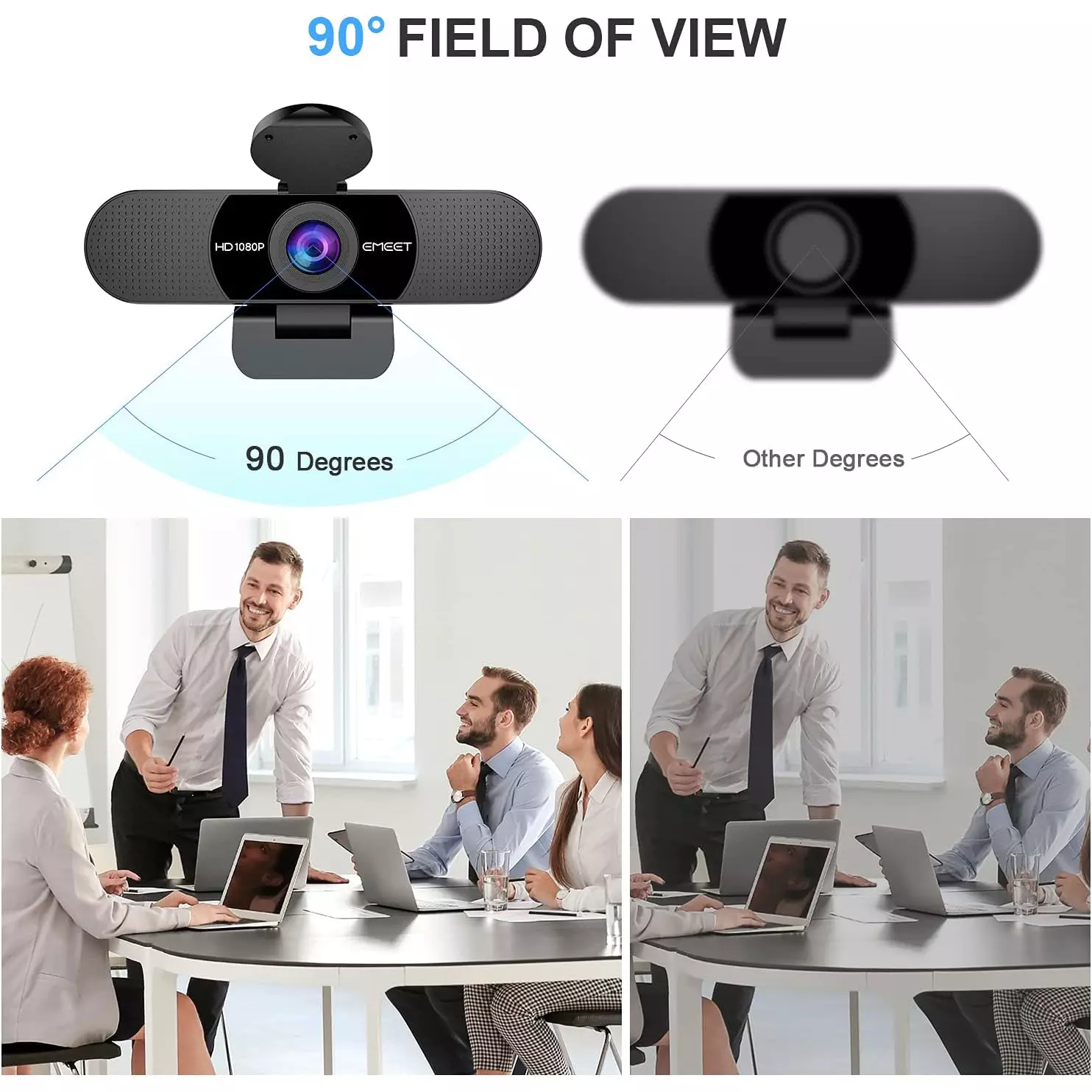 - 【Plug-and-play & 90 Degrees Wide View】No driver required. EMEET C960 pc webcam can be used without drivers to realize plug and play for saving your trouble. The convenient foldable design of web camera allows you to take it anywhere, and the USB cord is long enough for any task. The 90° wide-angle lens of USB camera can accommodate more participants. In video calls, there is no need to frequently adjust the direction of the web cam to show people in different positions.
