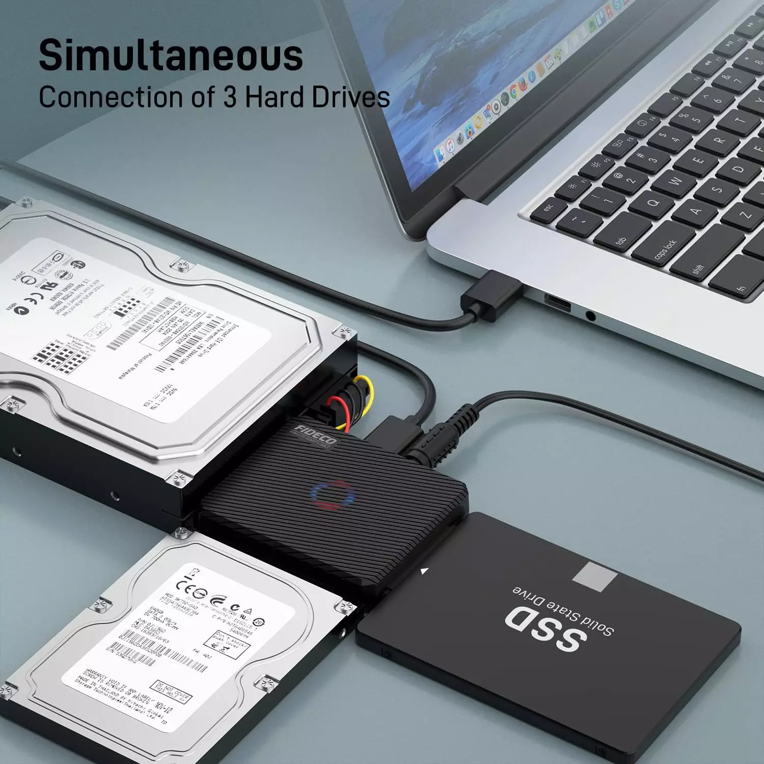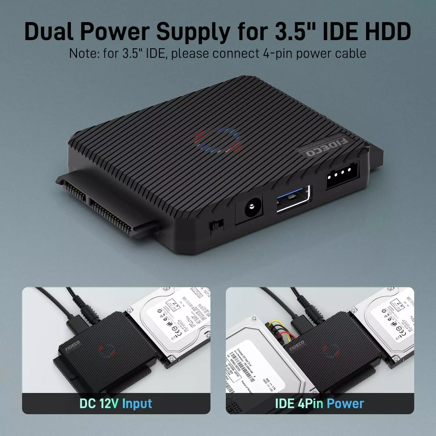 - 【Supported HDD/SSD】FIDECO IDE and SATA adapter is compatible with 2.5”/3.5” SATA/IDE hard drives. It can support the connection of 3 hard drives simultaneously: one 2.5” IDE, one 3.5” IDE, one 2.5”/3.5” SATA.