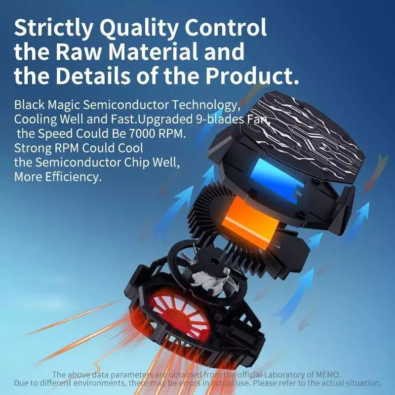 Both sides of the semiconductor use cold and hot partitions to block consumption. Optimized and upgraded 9-blade fan, The speed is up to 7000 rpm,The fan speed in daily use is about 4,000-5,000 rpm. The strong rotation speed supplies air to the heat-dissipating aluminum column, and takes out the heat of the mobile phone from multiple cooling vents