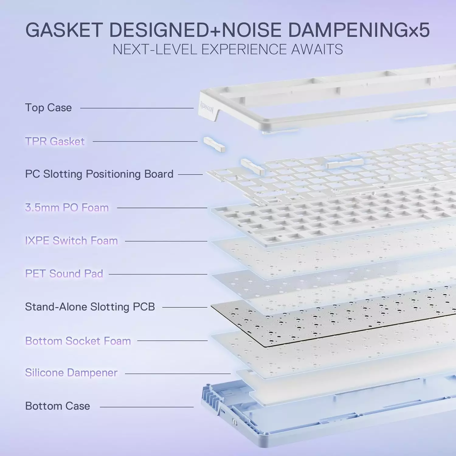 - REDRAGON GASKET OUT – The body structure differs from traditional screw fixing by using precision-locked covers with gaskets to assist with noise reduction and flexibility. It provides even feedback while the vertical cushioning reduces rigid noise, delivering a crisp, clean and softer typing feel.