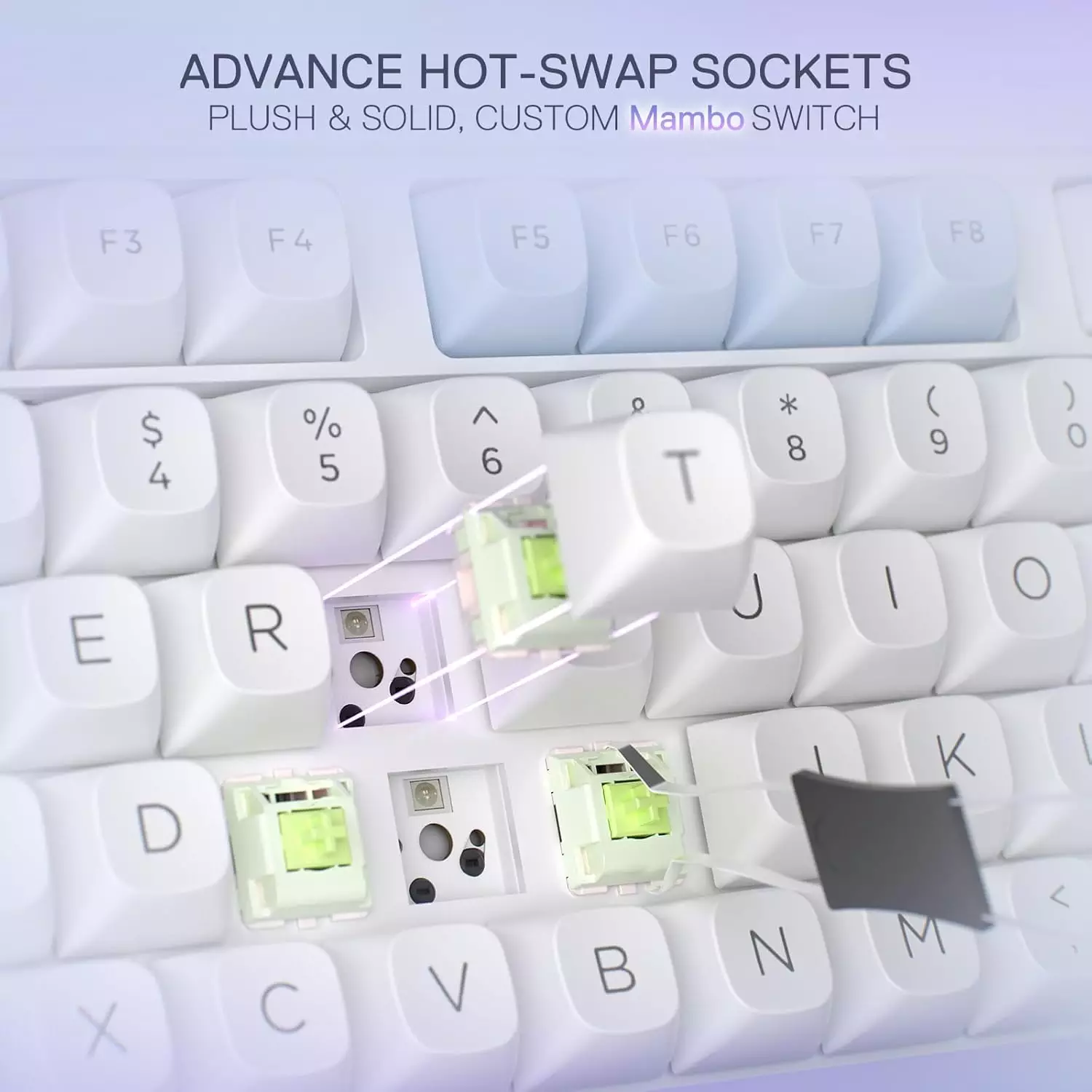 - Custom Mint Mambo Switch – With thick-lubed custom linear switches combo with a gasket form factor, K673 MAX features cushioned rich linear travel with silky creamy and cozy typing feedback. The brand new upgraded socket is nearly all switches(3/5 pins) compatible.