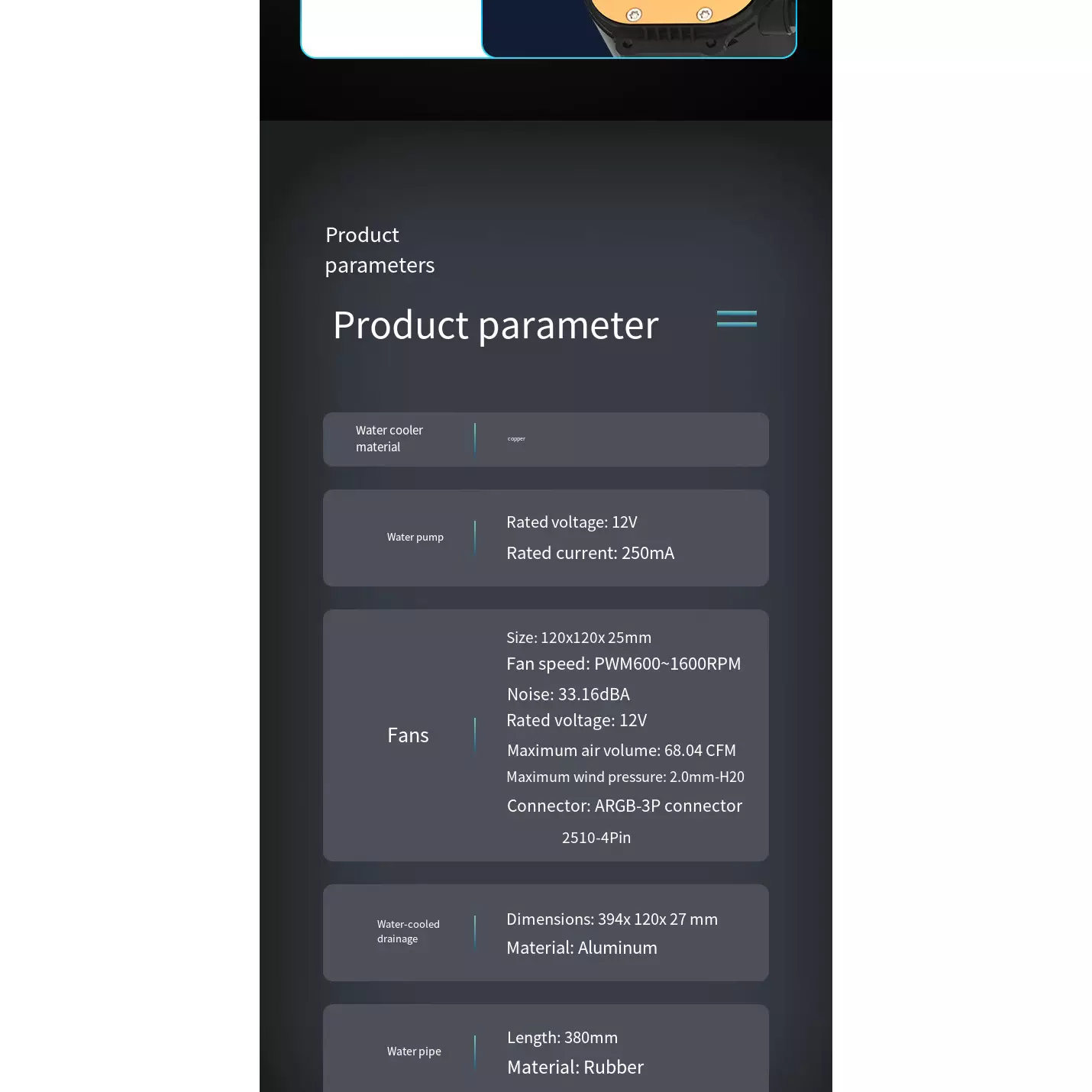 the base plate of this radiator is made of pure copper, with dimensions of 394 x 120 x 27mm. The radiator is made of aluminum and claims to use a “low-resistance and high-efficiency radiator channel design”. It is equipped with 3 120mm FDB fans, has a noise level of 33 dBA, and supports Intel LGA 20XX/1700/1200/115X and AMD AM5/AM4 platforms