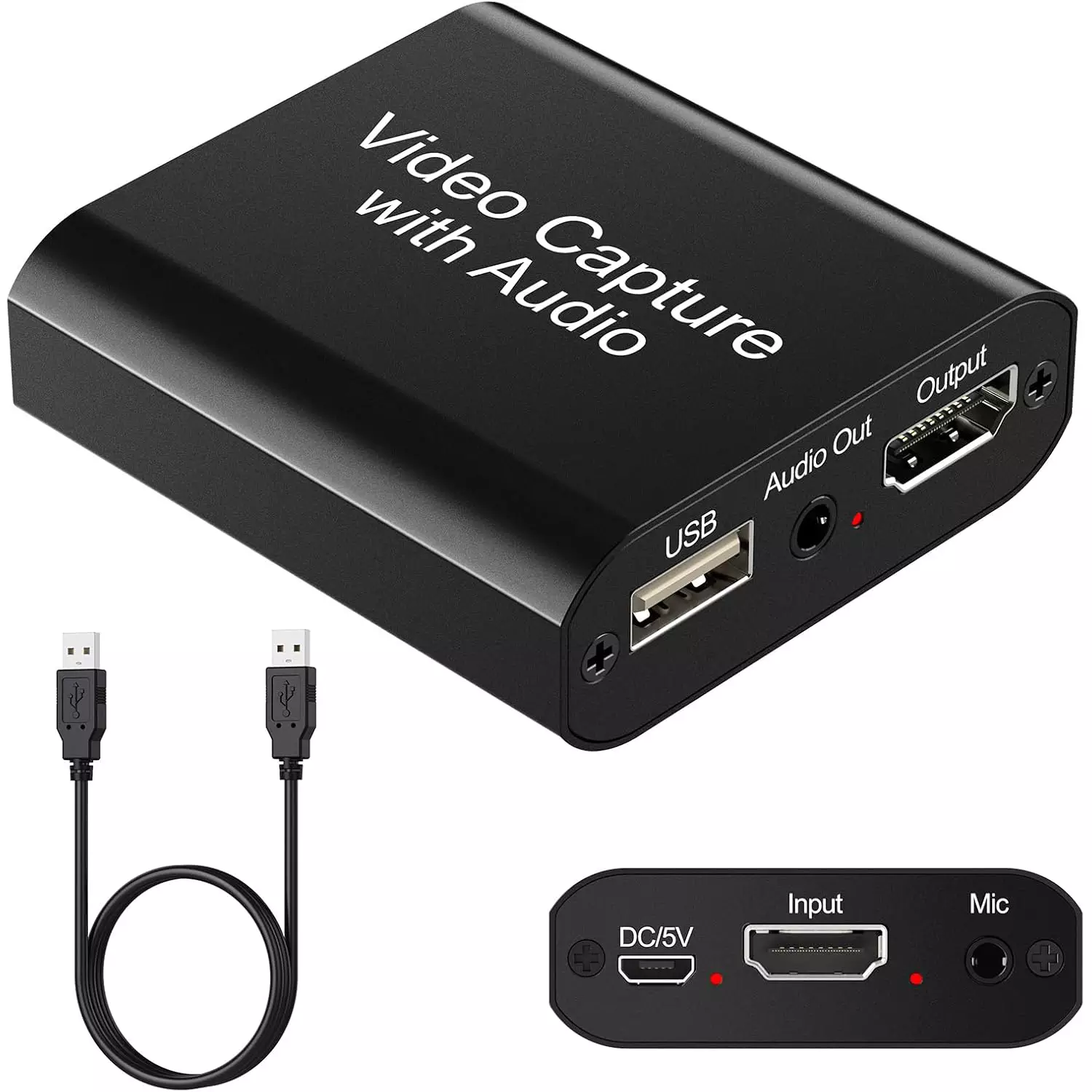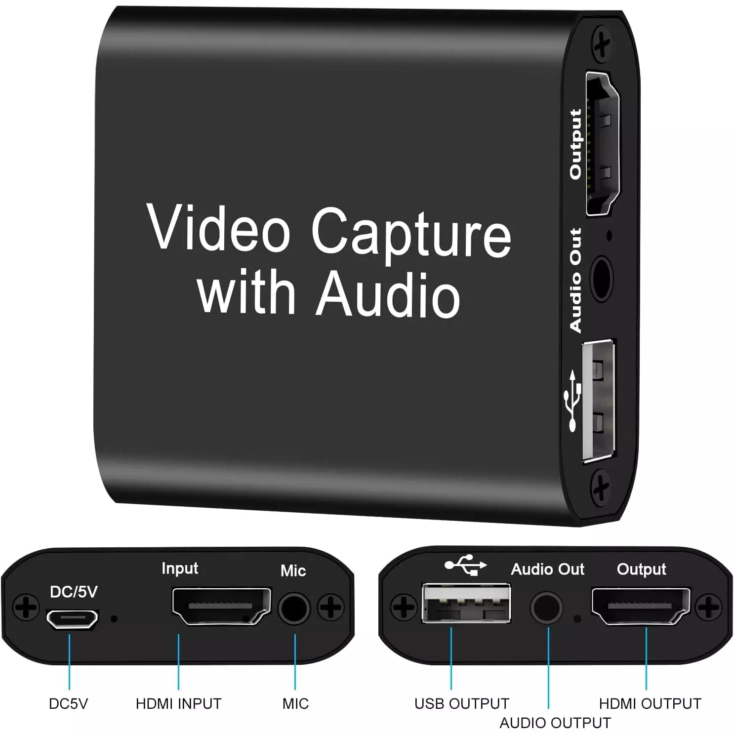 Technical Specifications Interface: HDMI to USB 2.0, HDMI Loop, Mic 3.5 Input(normal telephone mic is not acceptable, please prepare 3.5mm Mic), Power Backup Input: 38402160@30HZ (unencrypted HDMI) Output 1: HDMI (lag-free pass-through) Output 2: USB 2.0 Supported resolutions: 1080P/30,29,97,25,24,23,98, 1080i 50/60,720p50/50,480p,576,1280X1024,1280X960,1024X768,800X600,640X480 Compatible with most video source! Feature: HDMI Game Capture Card,you can record the game more easily. Add your voice to the game through Mic. And share it to social networking sites. Let more gamers know you. No need to install any driver, you can use any 3rd party software to capture or stream your HD game, or other HD video source. Support 1080P 30P HDMI Input/Output.It can be used for video conference, game collection, multimedia teaching scenario, etc,it has superior performance and compatibility than the previous versions. Plug and Play: Easy to use. No driver required, easily connect your DSLR, camcorder, or action Cam to your PC or Mac for game recording, share on youtube, facebook and twitter. Without external power supply, compact and portable. HDMI Capture Card, Easy Video Recording This video capture device can be connected to the source HDMI interface devices (such as: PS3,PS4,NS switch, XBOX, computer, laptop, DVD,HD player etc). Supports software such as: VLC, OBS, Amcap etc. And it support Windows, Mac OS, Linux and Android Systems. This video capture card can stream or record high-definition pictures of game consoles, meetings or other HDMI video/audio to your computer through capture software, or live broadcast/broadcasting over the internet easily.